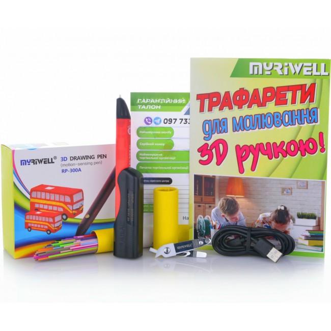 | Комплектація: | 3D-ручка, Зовнішній акумулятор MYRIWELL B14-300A, USB Type-C кабель, Інструкція, Гарантійний талон, 25 метрів PCL пластика (5 кольорів), Трафарети для малювання 3D-ручкою, Кусачки для обрізання пластика, Коробка. |